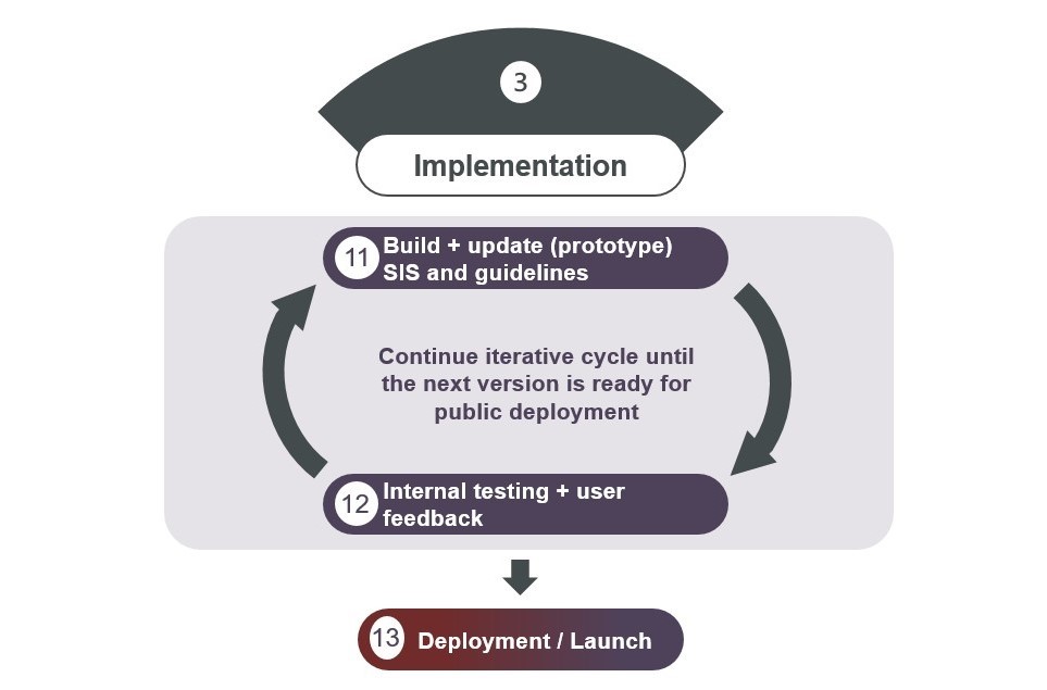 The implementation phase is composed of three components and intends to take the user through an iterative cycle for the build of the system. It primarily focuses on the capacity and skills of the operators, ensuring the SIS is functional and that it meets the user's needs.