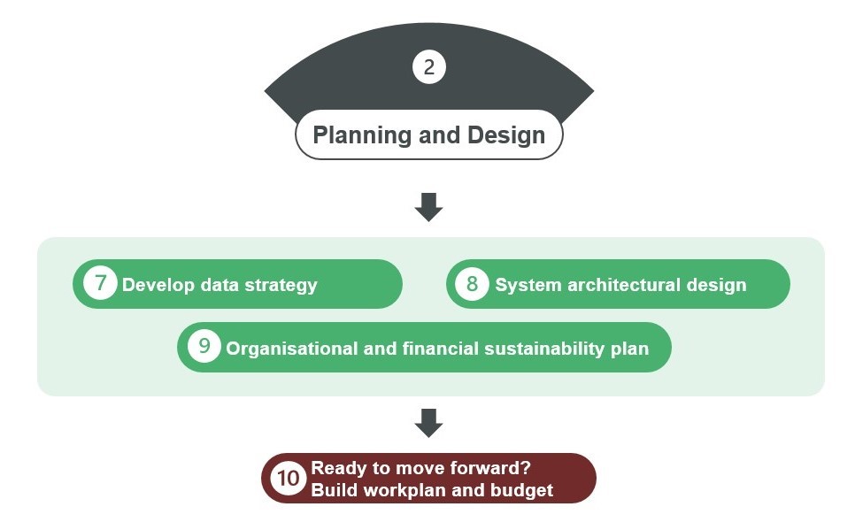 With funding secured and an understanding of what is needed and feasible from the activities conducted in the previous phase, the Planning and Design Phase has four components that seek to design the system, plan for best practice data governance, sharing and management, and establish a formalised financial sustainability plan.